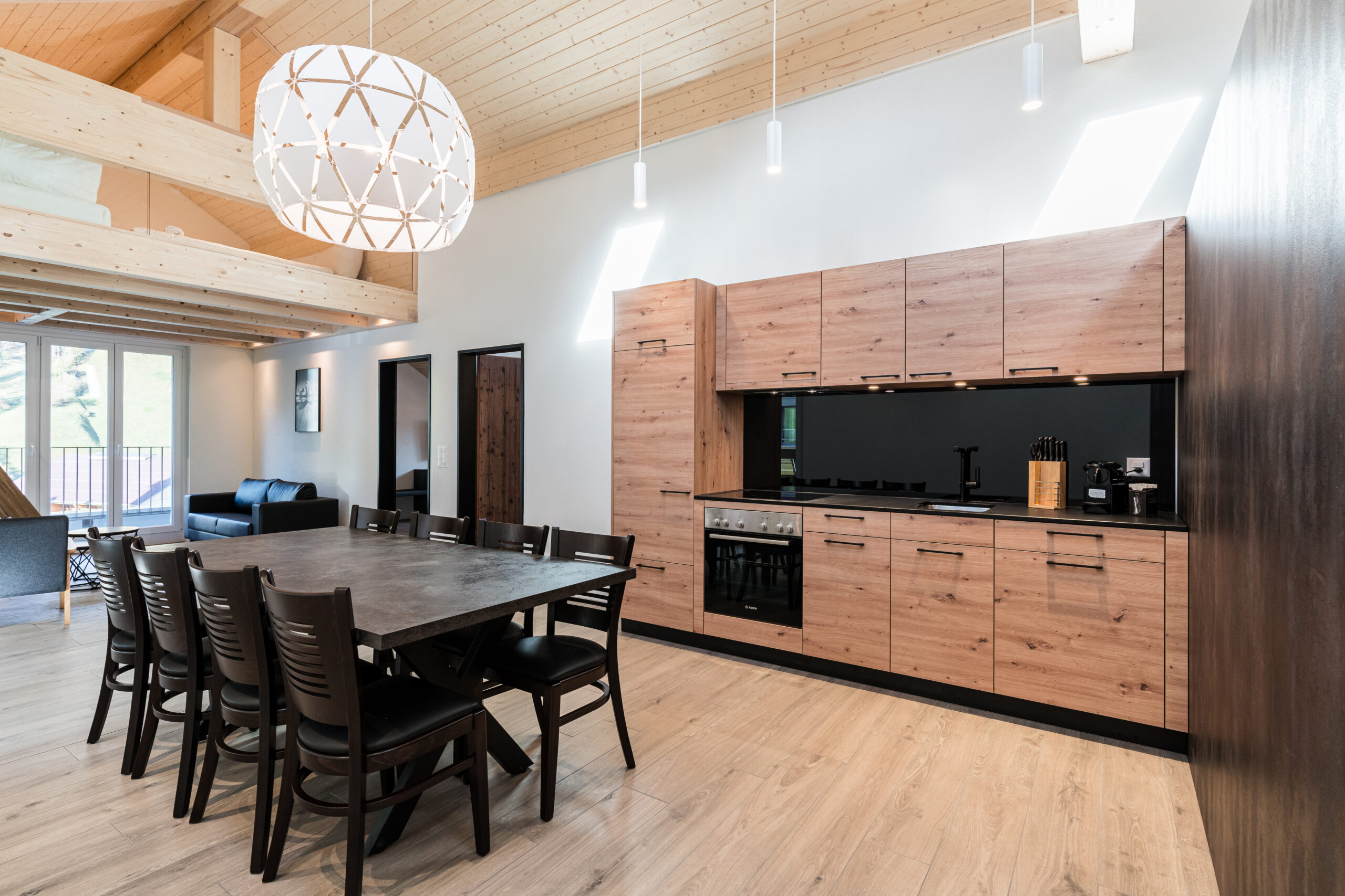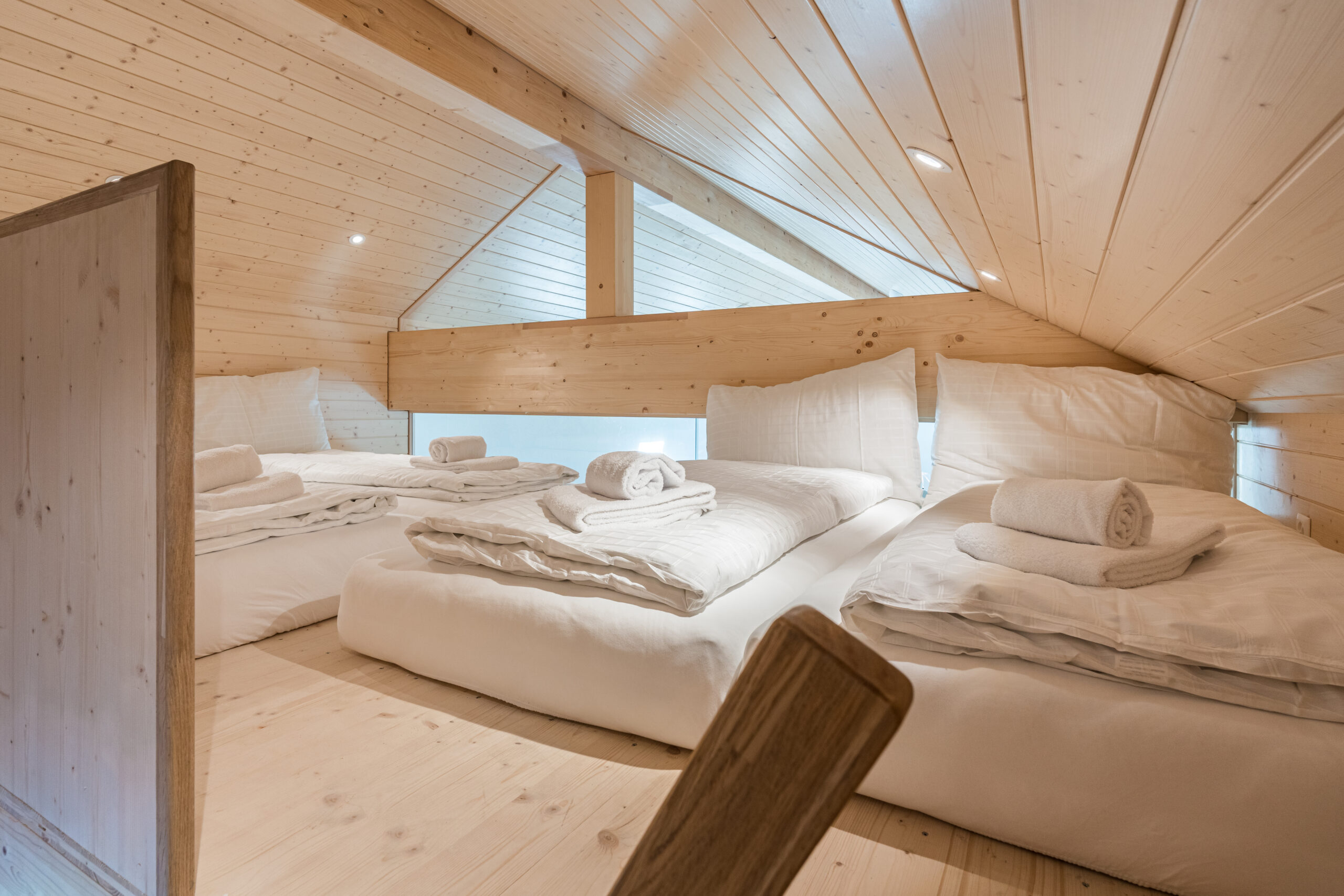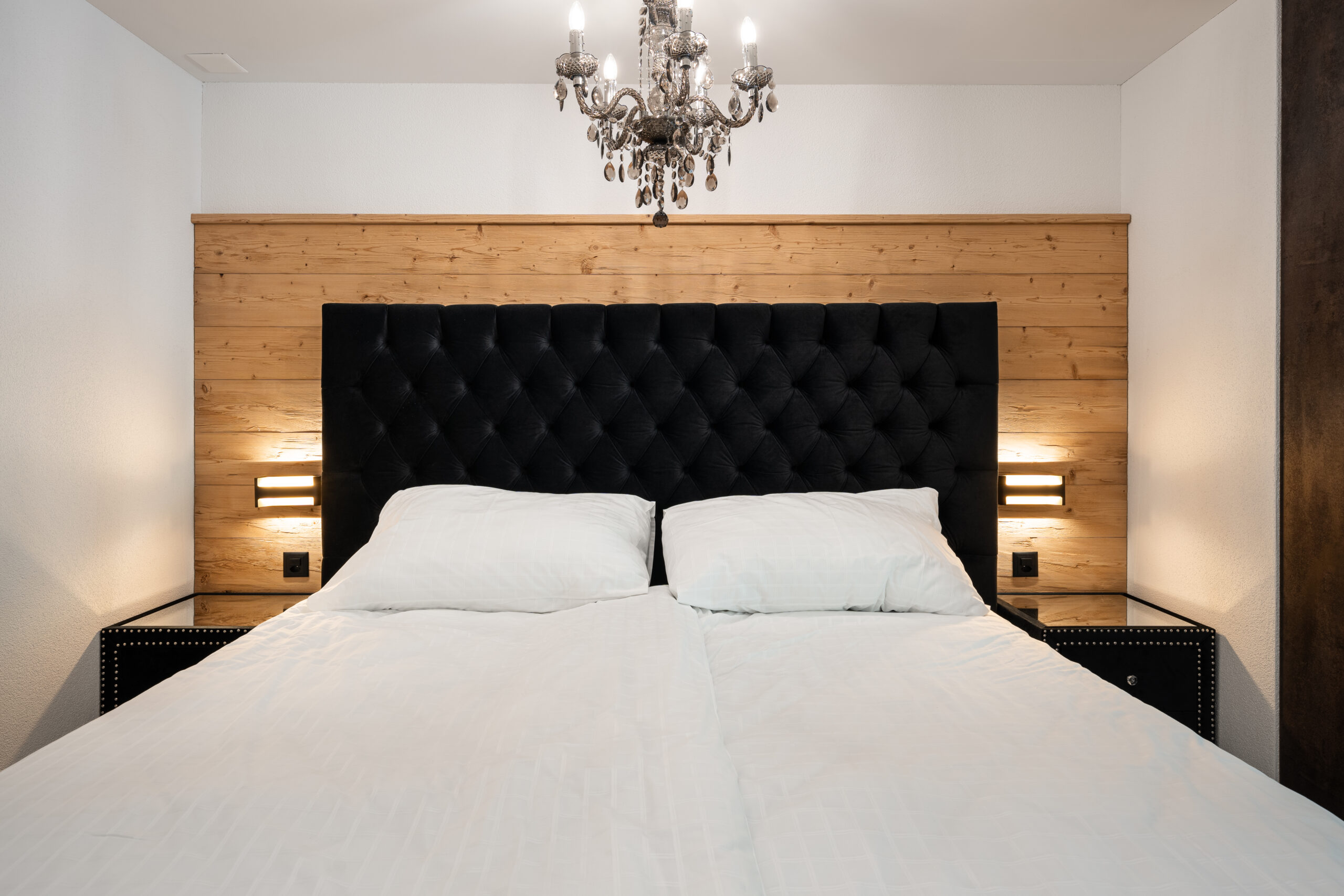 Die modern gestalteten, rund 30 m² grossen JUNIOR SUITEN umfassen eine Küche mit Esstisch und 2 Stühlen, ein Boxspringbett und ein Badezimmer mit Dusche.