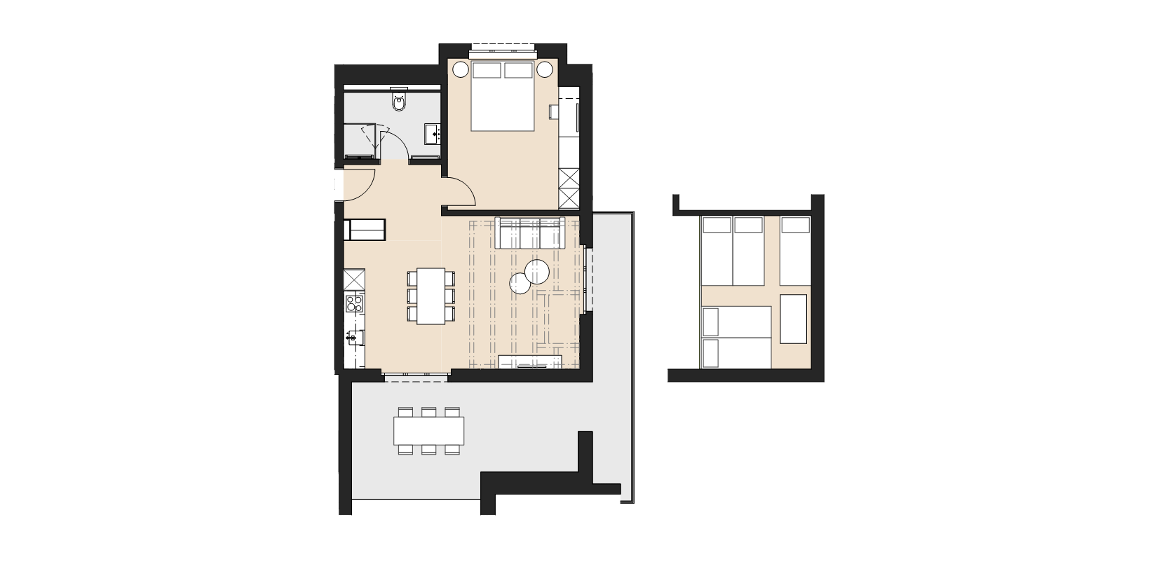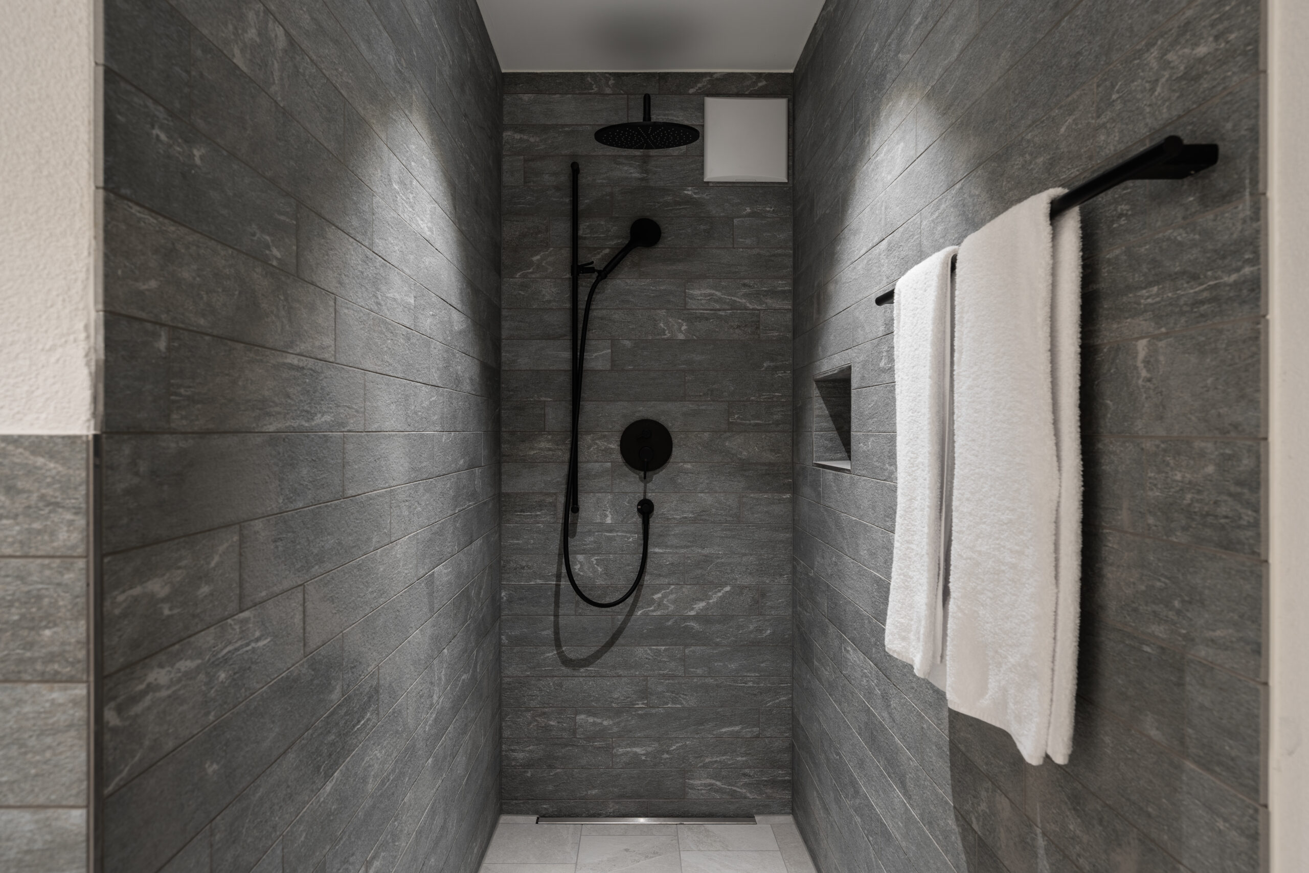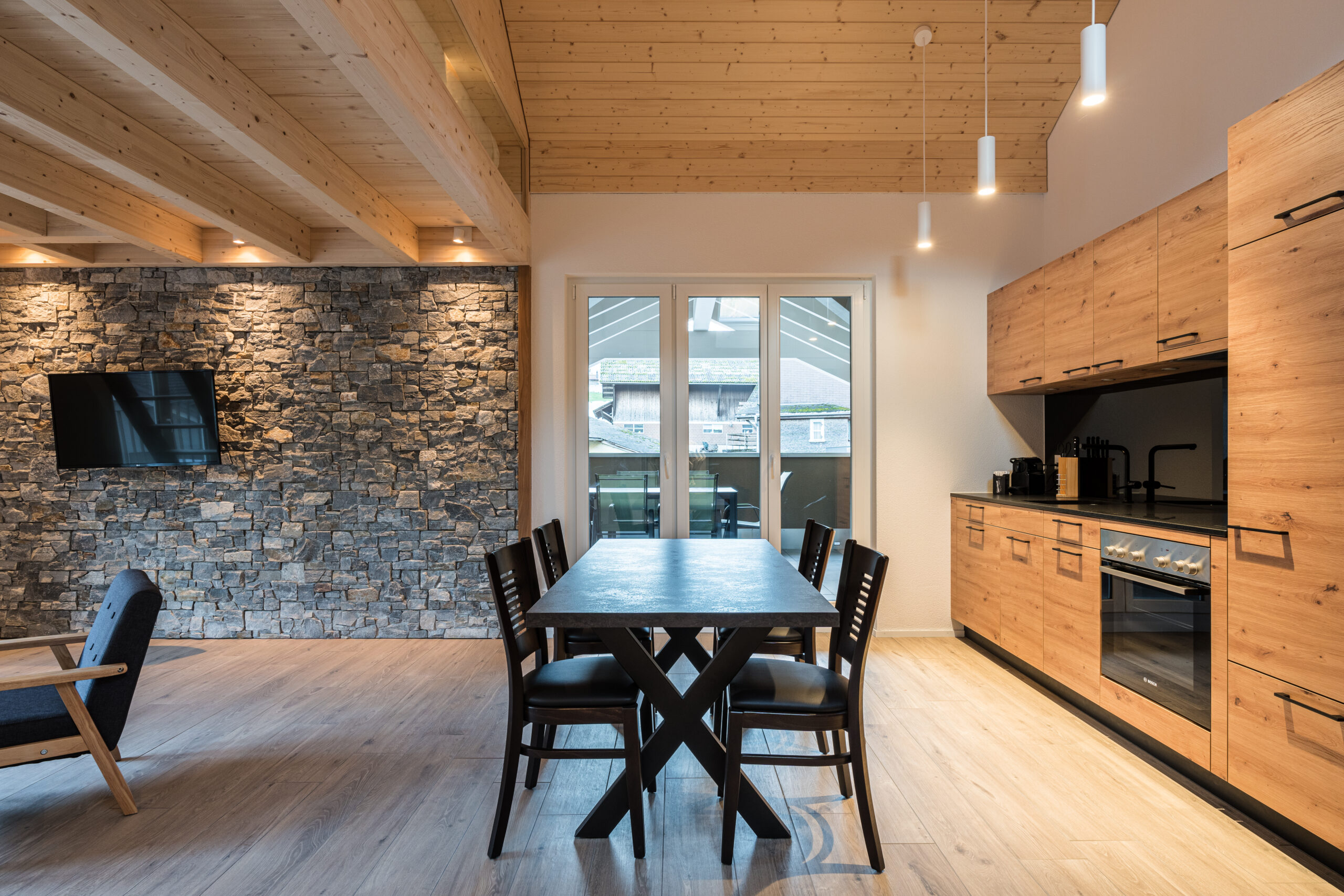 Die modern gestalteten, rund 30 m² grossen JUNIOR SUITEN umfassen eine Küche mit Esstisch und 2 Stühlen, ein Boxspringbett und ein Badezimmer mit Dusche.