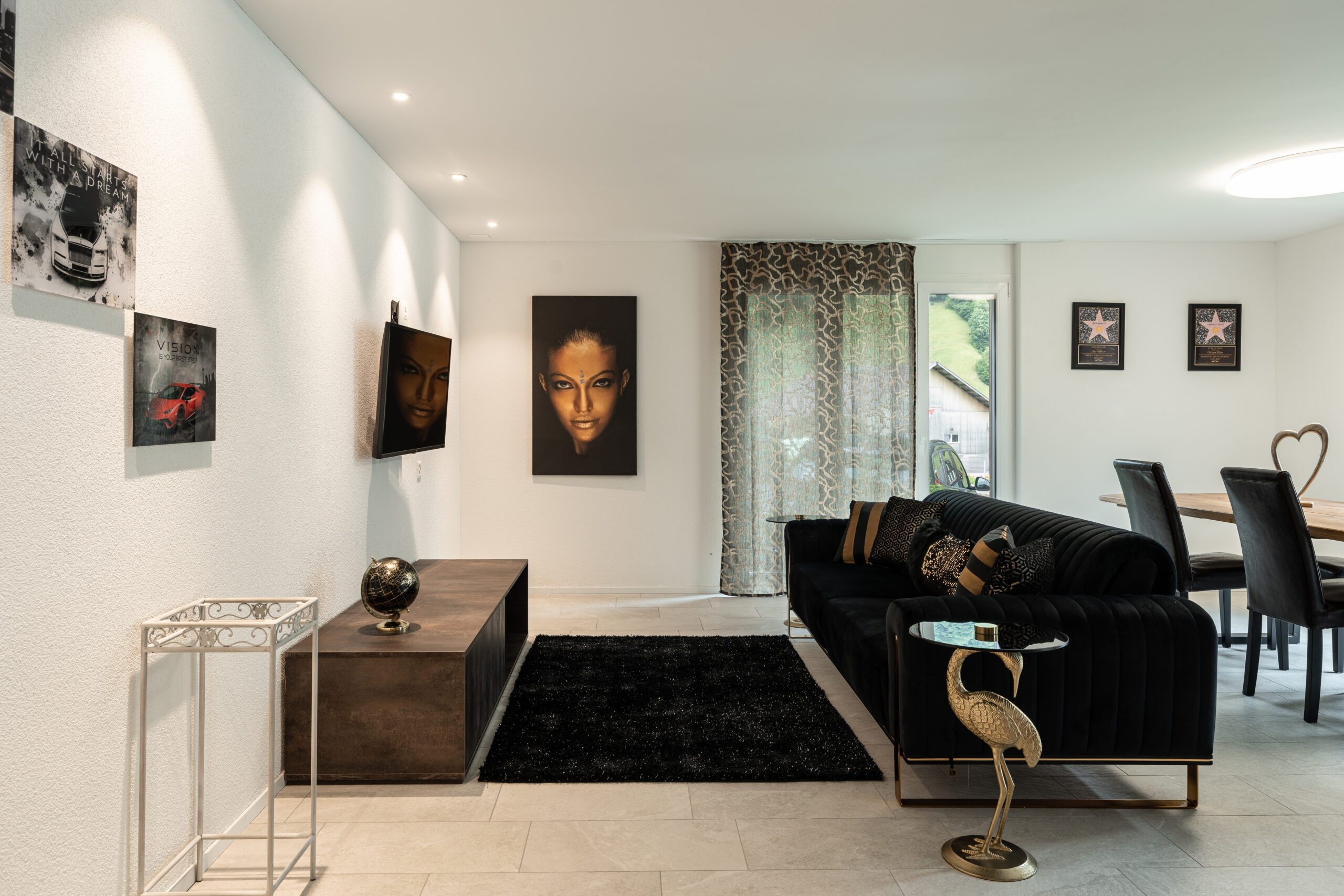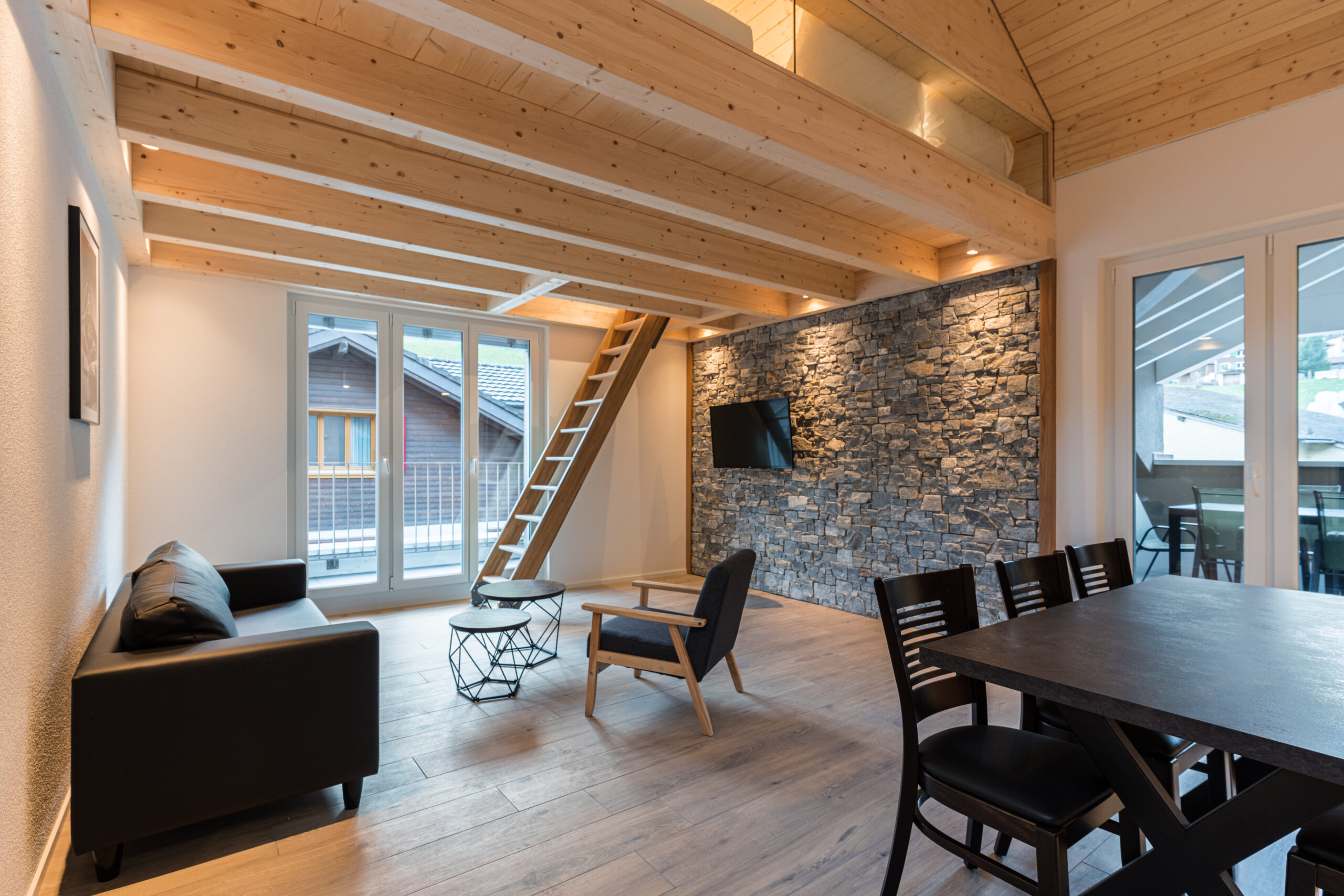 Der Blick durch die breite Fensterfront richtet sich auf die Bergen des Melchtals. Der helle Raum zeichnet sich durch klare Linien, dezente Farben und ein modernes Mobiliar aus. Sanfte Grau- und Brauntöne fangen die Farben der umliegenden Landschaft ein.