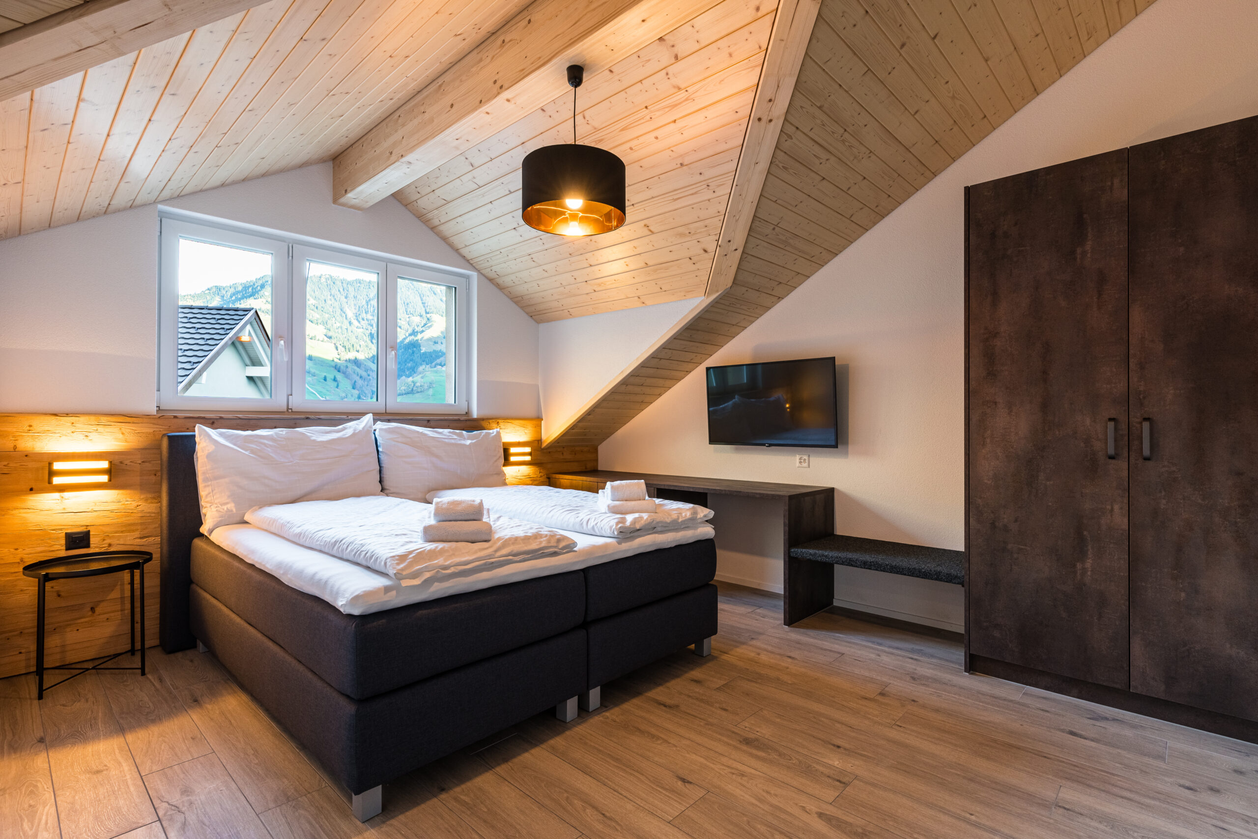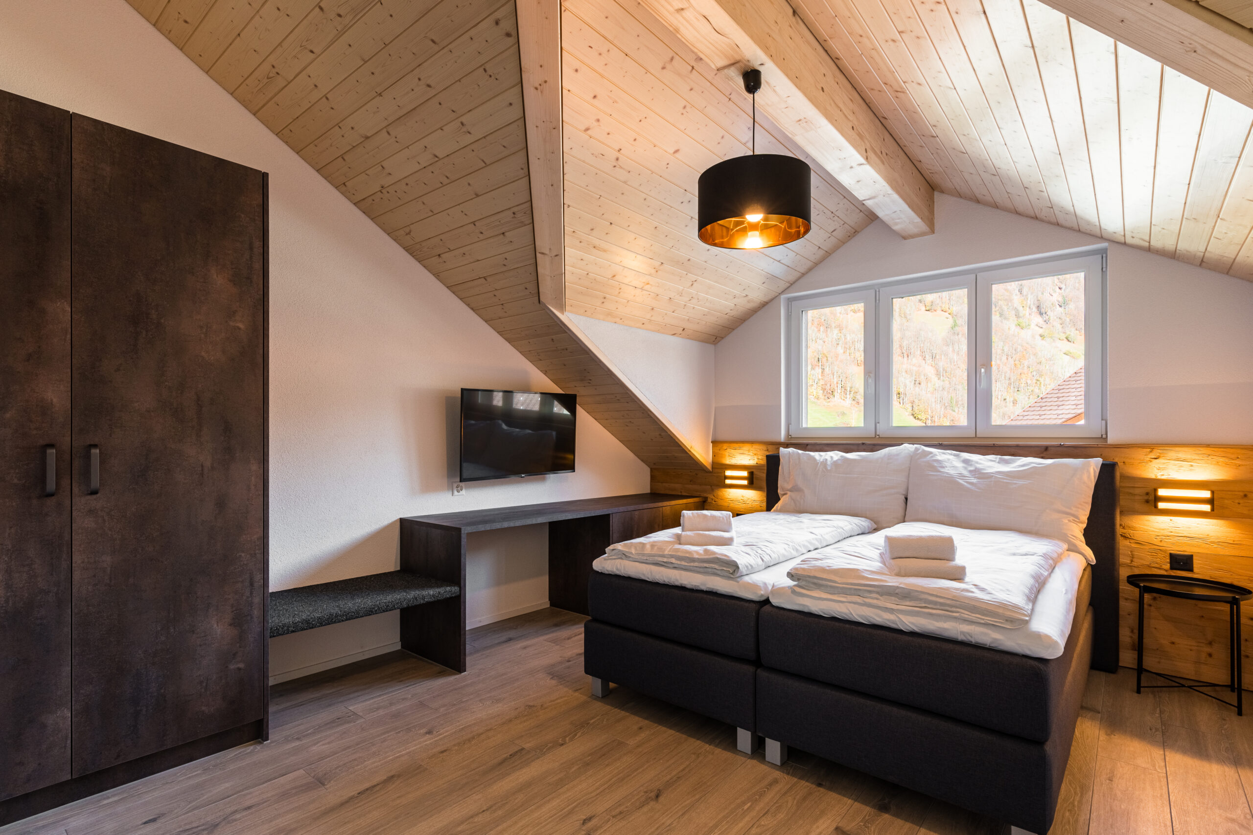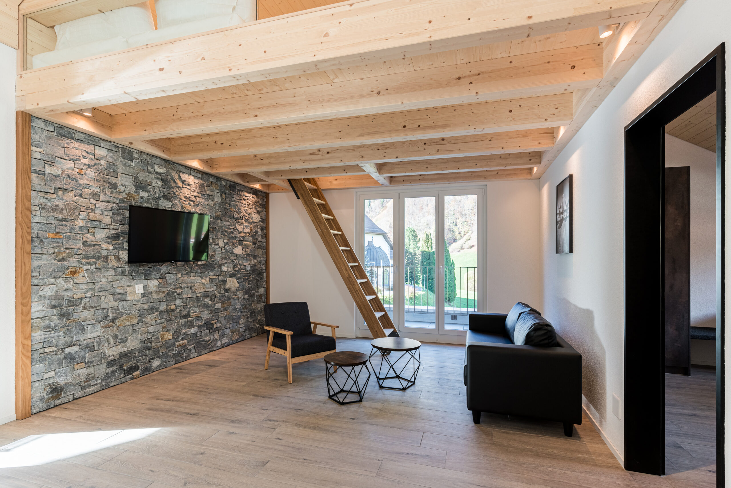 Auf dem Balkon (Obergeschoss) oder der Terrasse (Erdgeschoss) geniessen Sie die Natur und die Sonnenstrahlen der Bergwelt. Eine Suite für zwei Personen.